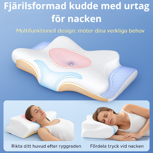 Många upplever märkbar lindring redan efter första natten – din nacke vilar bättre och spänningar minskar direkt. Med en ergonomisk fjärilsformad design som aktivt stöttar att hålla ryggraden i naturlig linje, bidrar kudden till att du vaknar utan stelhet eller smärta